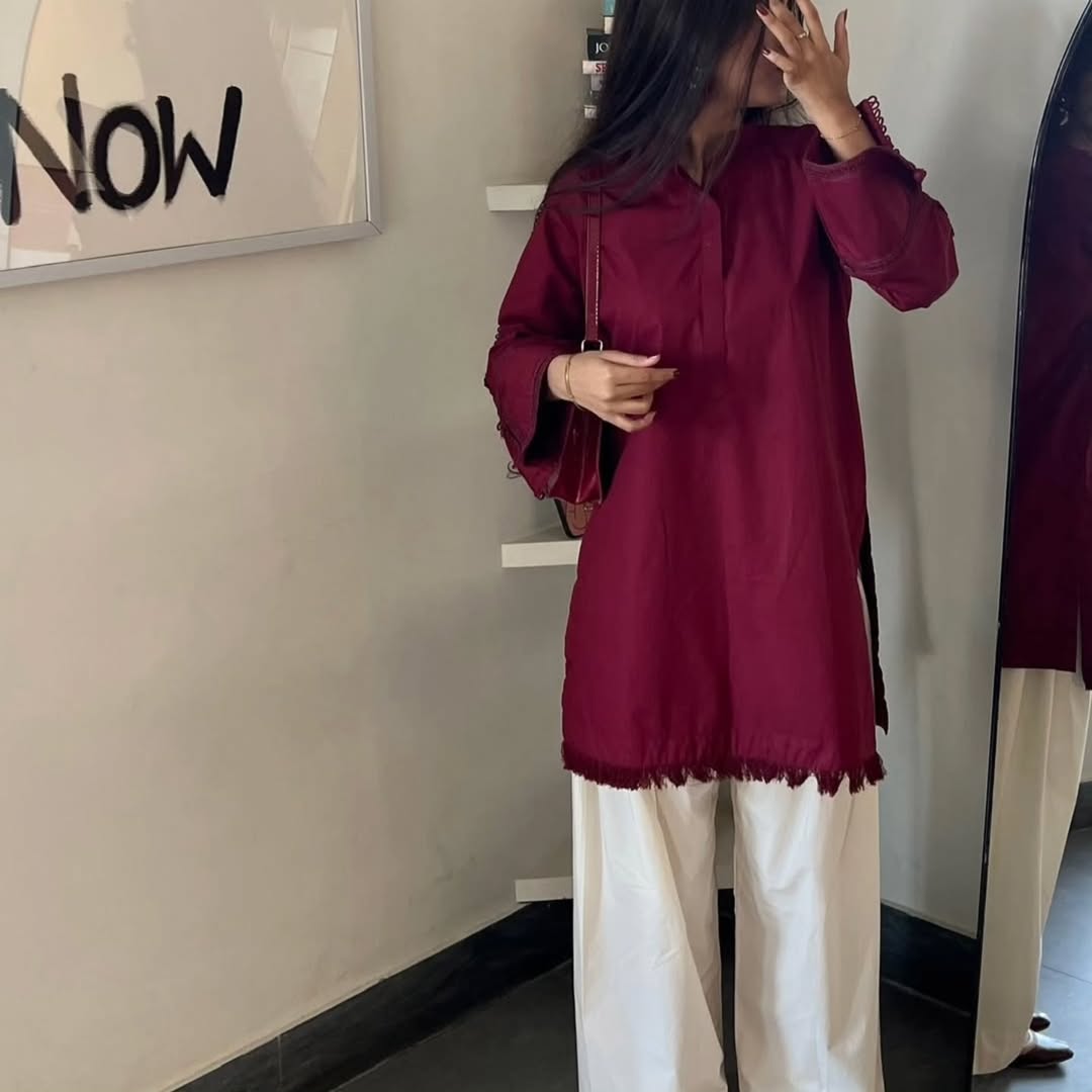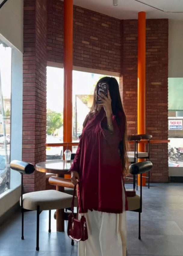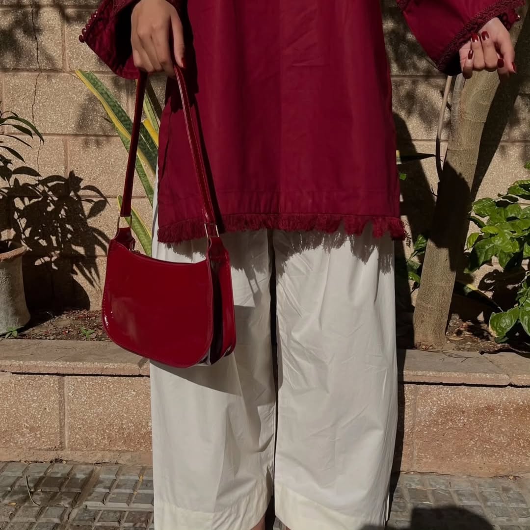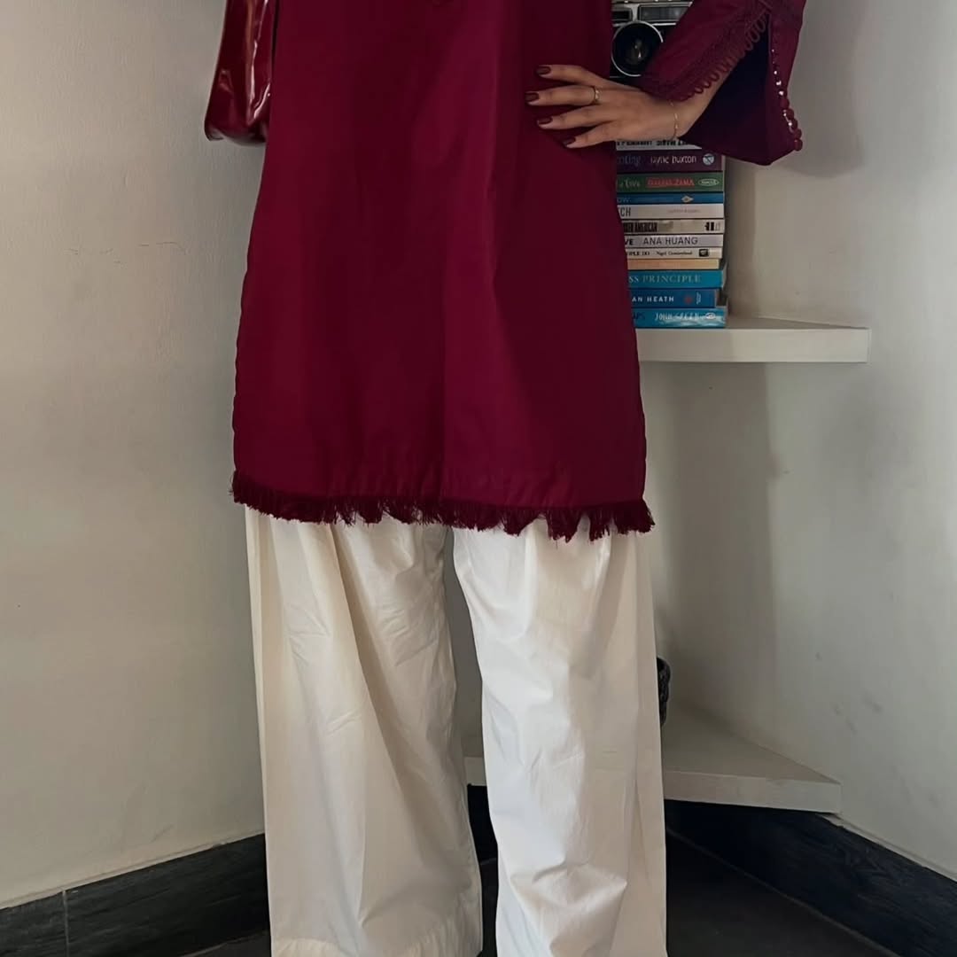 A stylish red shirt paired with white lawn straight trouser. The shirt features a bold red hue, perfect for any occasion. The white trousers add a crisp contrast, creating a sharp, fashionable look.