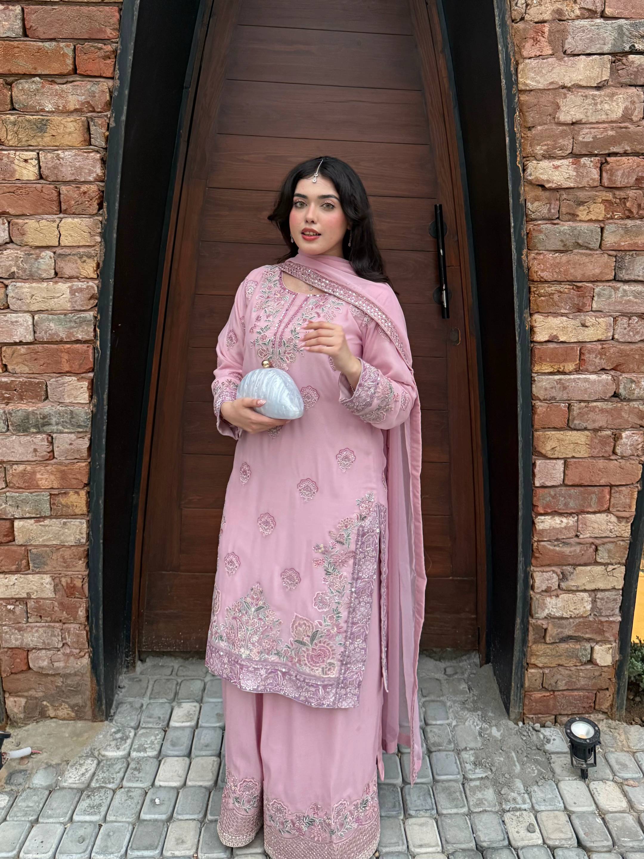 A timeless lilac-pink karandi ensemble, delicately crafted to reflect elegance and detail.