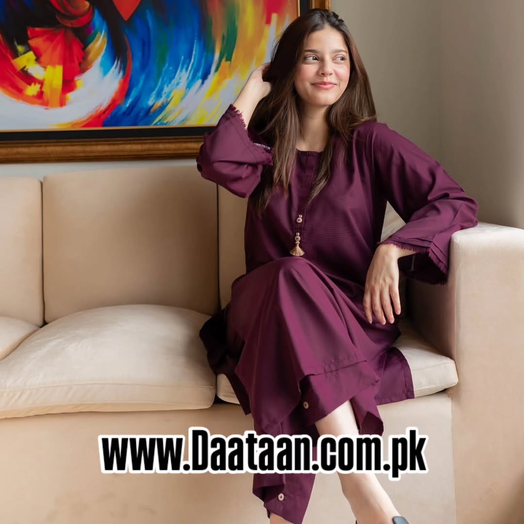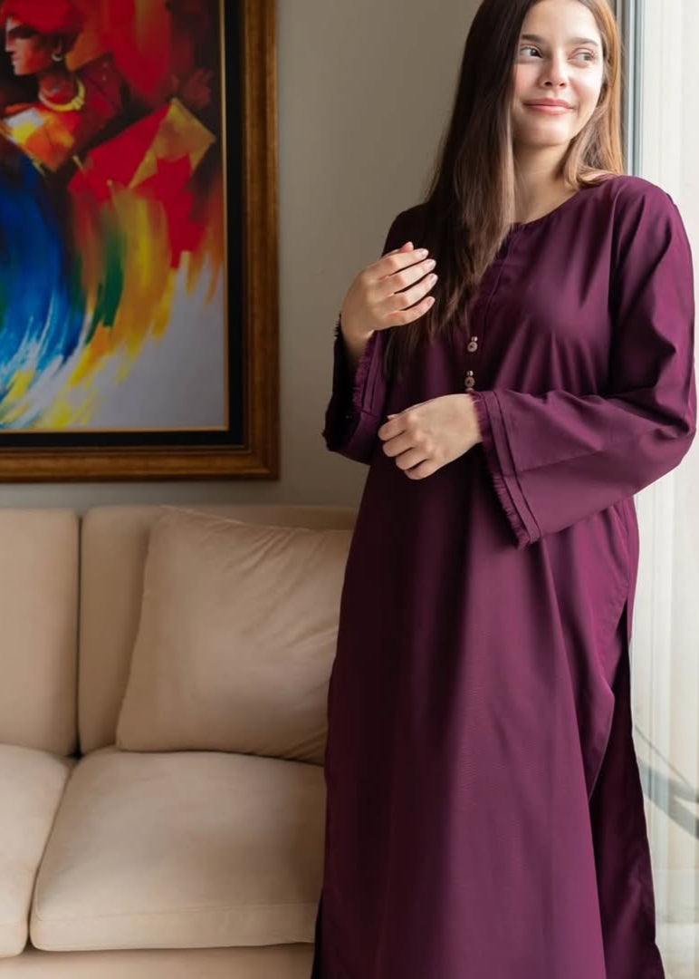 This elegant dark purple cord set features a long, straight shirt paired with matching straight trouser. The shirt is designed with full-length sleeves, offering a modest and graceful silhouette. Intricate drilling embellishments adorn the neckline, adding a subtle touch of sparkle and detail. Perfect for semi-formal occasions, this outfit combines comfort with refined sophistication.